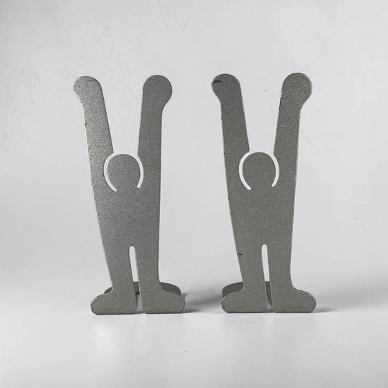 Offering here a pair of original vintage bookends designed by pop art icon Keith Haring. The set features the world-famous and expressive "Hands Up" silhouette, combining functional storage with a true gallery flair for your home bookshelf. The bookends are simply slid under the first and last pages of a book, so the weight of the books themselves provides maximum stability. A wonderful collector's item for lovers of 80s/90s design and contemporary art. Details & Provenance: • Artist: Keith Haring (1958–1990) • Motif: "Hands Up" / Stylized Figure • Authenticity: Officially licensed, with clearly embossed "© HARING ESTATE" on the base of both bookends. • Material: Metal • Era: Circa 1990s Dimensions (per bookend): • Height: 15 cm • Width: 6 cm • Depth: 7.5 cm Condition: The bookends are in honest, used vintage condition. They show authentic signs of age and use, including visible scratches and minor chips in the coating/paint (please see the detailed photos). The metal is not bent, and the bookends function perfectly. The existing patina emphasizes the industrial and historical character of these original editions. Private sale. Keith Haring, Haring Estate, Pop Art, Pop Art Classics, Postmodern Design, Postmodernism, Functional Art, Sculptural Silhouette, Minimalist Contour, Figurative Design, Anthropomorphic Forms, Vintage Bookends, Statement Piece, Investment Piece, Official Estate Edition, Industrial Aesthetics, Brutalist Metal, Industrial Finish, Authentic Patina, Tactile Design, 1980s, 1990s, Eclectic Interior, Loft Style, Gallery Quality, Iconic, Hands Up Motif ]