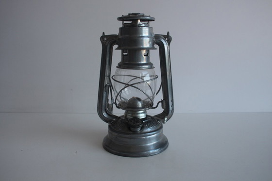 Old kerosene lamp in metal design with glass cylinder and wick regulation.
