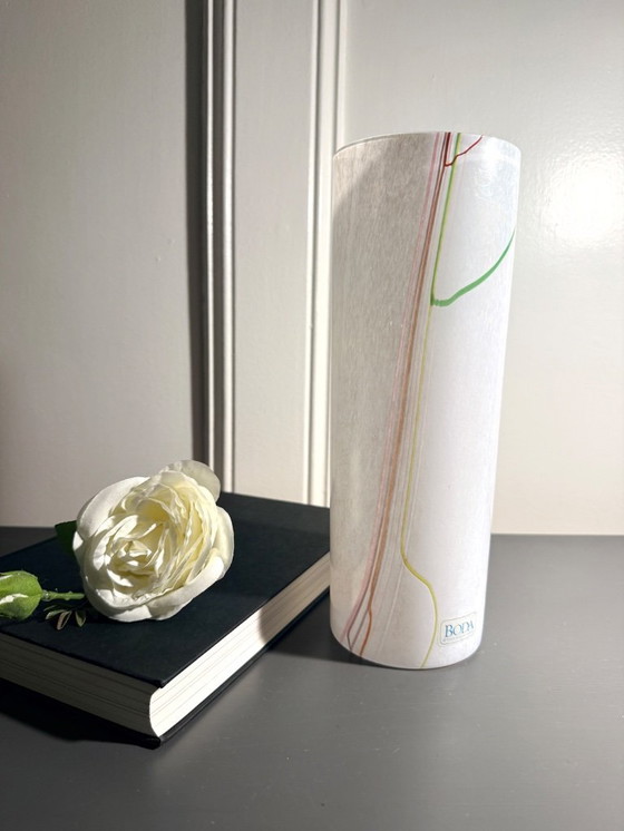The vase is crafted from opalescent, frosted white glass, decorated with delicate hand-applied glass threads in soft, swirling colors. Its minimalist silhouette and ethereal glow make it a timeless piece of Scandinavian design, perfect for both collectors and modern interiors.