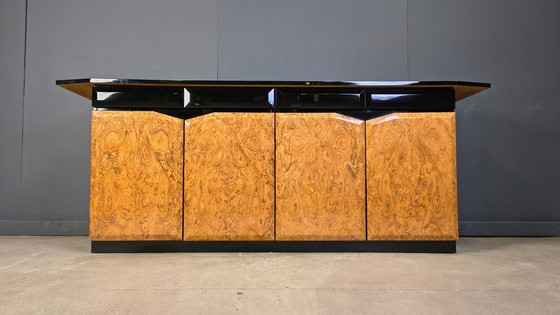 Luxurious 1980s sideboard made from black lacquered wood with burl wood doors and top.