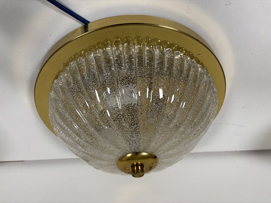 Large vintage ceiling lamp by MCM Schröder & Co. Beautiful mid-century design. 1970s large ceiling lamp made by the German company Schröder & Co. Round brass base with a large ice glass shade with amber hues. In good vintage condition. Diameter: 35cm Height: 18cm 3-bulb E27 fitting