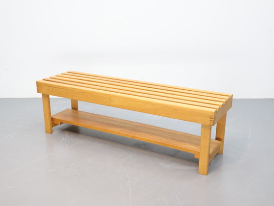 This is a beautifully handcrafted vintage slatted bench made from oak wood. Its design features a classic slatted top with a sturdy lower shelf, perfect for additional storage or display. The bench showcases the natural grain of the oak, adding a touch of rustic charm to any space. Ideal for hallways, living rooms, or as a unique seating option in your home.