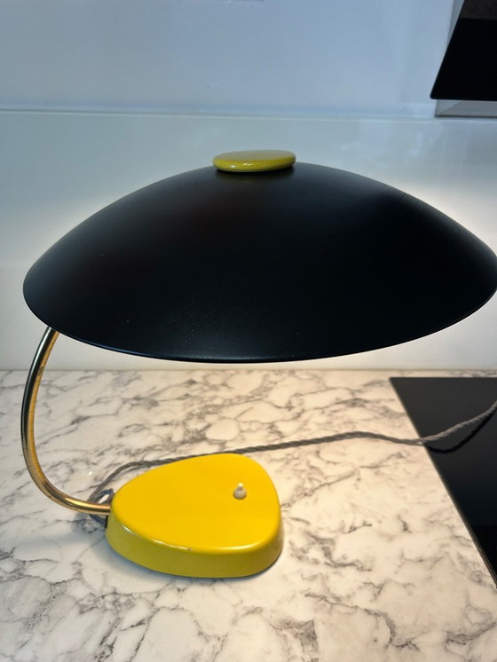 Beautiful, highly distinctive, vintage black and yellow desk lamp in Bauhaus style, with an exceptionally large shade that can be tilted to multiple positions, allowing the light to be dimmed as desired. The lamp was produced in the 1950s by LBL of Leipzig (formerly Körting und Mathiesen AG; brand name Kandem) during the GDR era. The lamp is in perfect condition and includes its original cord.