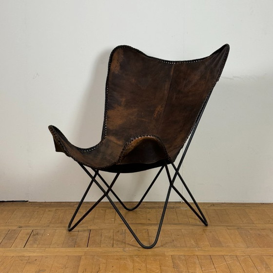 Vintage butterfly chair from the 1990s, featuring a black-painted steel frame and a genuine leather sling. This iconic design offers a practical, lightweight structure with exceptional comfort—perfect for both indoor and outdoor spaces with a modern, relaxed vibe.