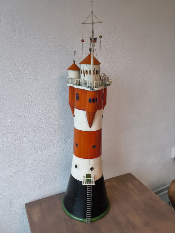 This impressive vintage lighthouse is a handcrafted masterpiece that exudes maritime charm. Standing 108 cm tall, this metal artwork is a striking addition to any interior. The lighthouse is rich in detail, including a lifeboat, lifebuoy, flagpole, pulleys, and stairs, all of which contribute to its authentic appearance.