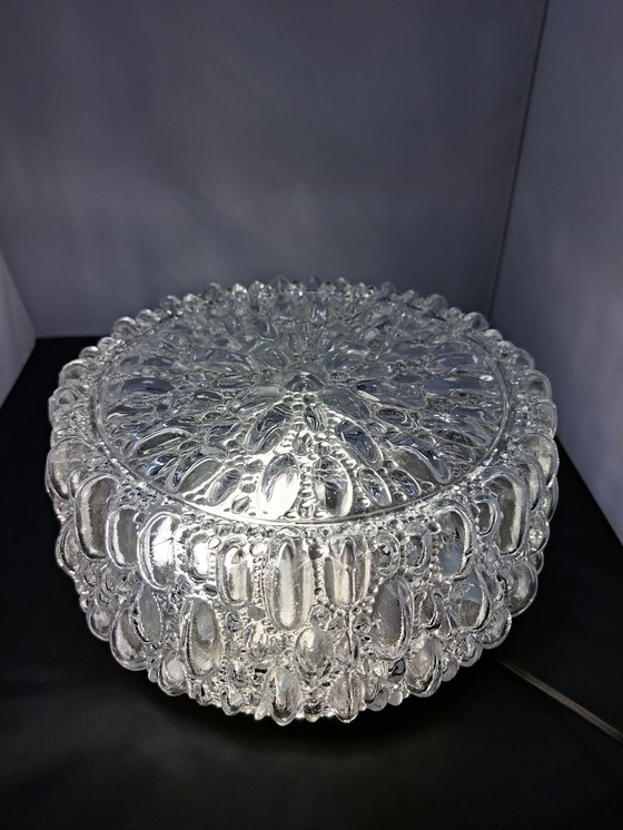 Beautiful vintage ceiling or wall lamp by the German design brand Limburg (Glashütte Limburg), model 665. This model is known for its heavy pressed glass with a characteristic "bubble" structure, which creates a particularly beautiful play of light.