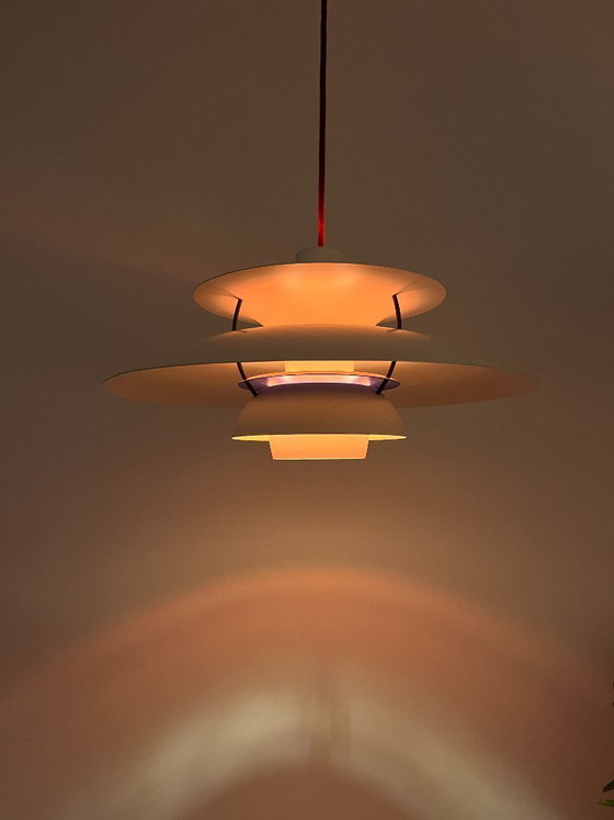 This is the iconic Louis Poulsen PH5, one of the most recognizable Danish design lamps ever made. Its layered shade design ensures soft, glare-free light, creating a warm and inviting atmosphere. The PH5 is a true classic of Danish Mid-Century Modern design and a statement piece in any interior.