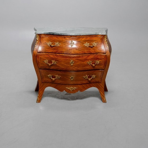 A Louis XV style commode featuring a curved front and marquetry with geometric motifs. It rests on a curved frame, inspired by 18th-century furniture.