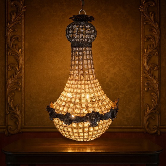 A beautiful vintage pendant lamp/chandelier with crystals (glass) and a metal mesh. The lamp is made in the Louis XVI or Empire style. The lamp is surrounded by bronze angel heads and a beautiful floral motif. To replace the bulbs, the flowers can be unscrewed, allowing the base to be loosened. The lamp is equipped with 6 refrigerator lights that shine the light in all directions, creating beautiful colors from the crystals. In short, a beautiful lamp for a classic interior.