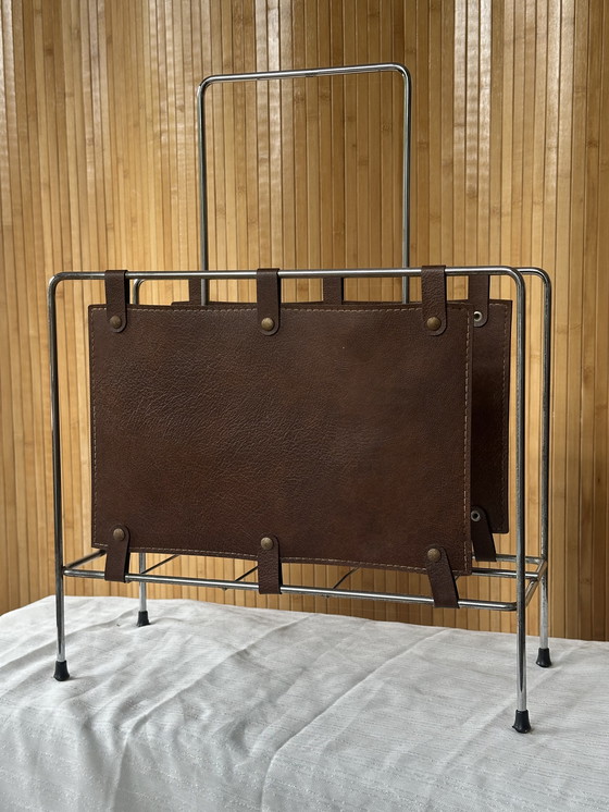 Vintage magazine rack with a chrome frame and brown leather details. Stylish and functional for storing magazines and newspapers. Originating from Italy. In good vintage condition.