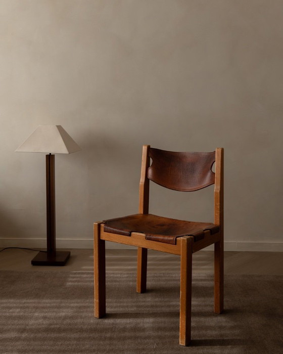 The design combines a solid elm frame with a floating saddle-leather seat and backrest, giving the chair a strong brutalist yet warm rustic presence. The cognac leather shows a deep, even patina and beautiful wear that adds a lot of character.