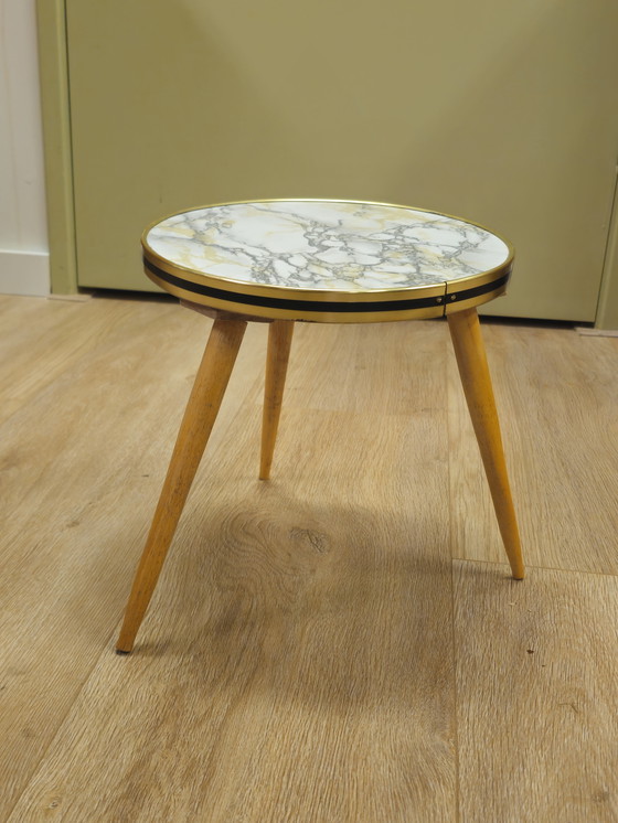 Vintage rond plantentafeltje met marmer-look formica tafelblad messingkleurige bies met zwarte streep en conische pootjes.
