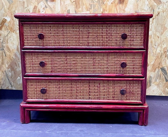 Burgundy red chest of drawers from the 1980s in good condition. Originally sold at Roche Bobois, a mark of quality. Wood and rattan, one small chip under a handle.