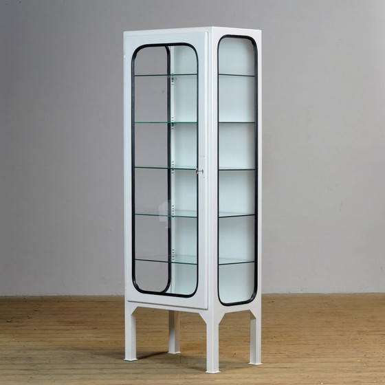 Vintage medical cabinet from the 1970s, made in Hungary. This characterful cabinet is made of iron and glass, with the glass secured to the steel with a rubber strip. The cabinet has a sleek, timeless design and fits perfectly in an industrial, modern, or mid-century interior. Equipped with a well-functioning lock and key, it’s ideal for storing tableware, collectibles, or designer pieces. The cabinet comes with five adjustable glass shelves, allowing you to easily customize the layout. A unique and functional eye-catcher with an authentic vintage look.
