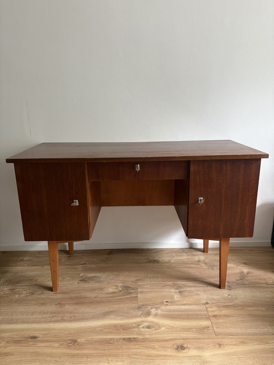 Beautiful original desk in typical Mid - Century style with clean lines and tapered legs. Made of wood veneer with a warm red-brown hue. Equipped with two cabinets and a central drawer.