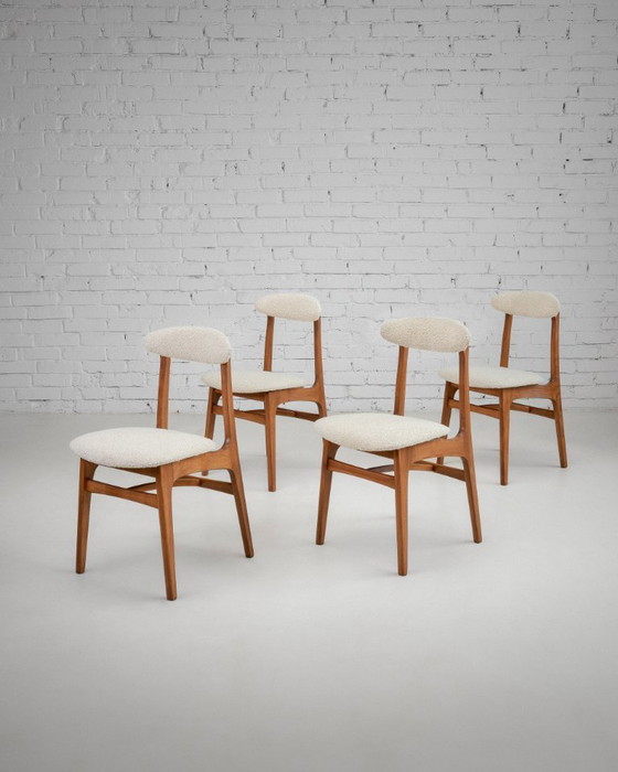 Each chair is crafted from solid beechwood. In our workshop, we carefully restored the frame while respecting its original character. The seat and backrest have been newly upholstered with high-quality fabrics, ensuring both durability and comfort. These chairs are now ready to serve for generations to come.