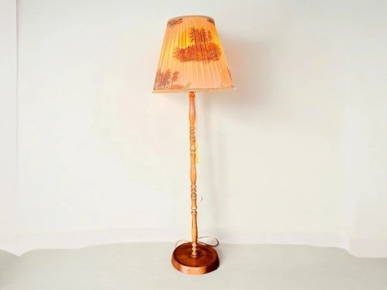 A classic floor lamp with a turned solid wood lamp stand. A very sturdy and robust German handcrafted piece.