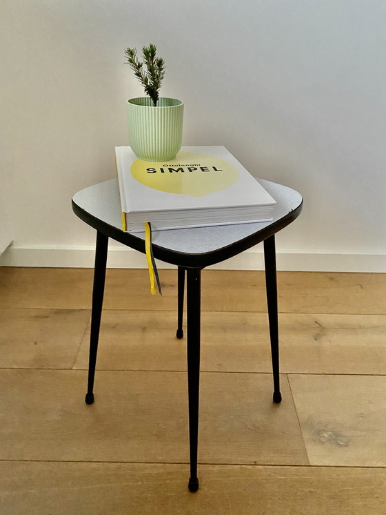 Vintage metal kitchen stool with a white Formica seat. This stool dates from the 1960s and features the familiar Brabantia style. It is in good, vintage condition.