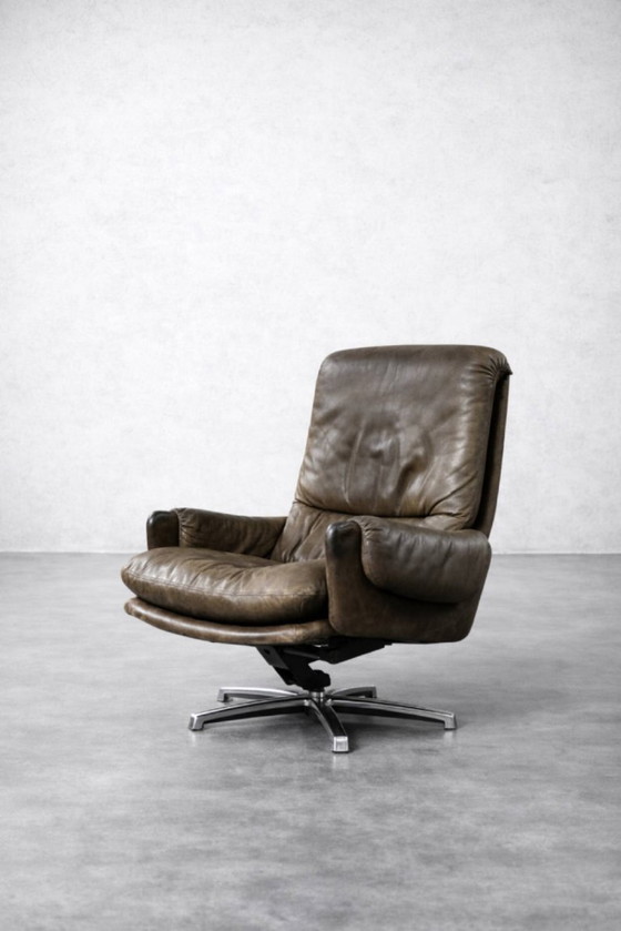 This lounge chair was manufactured by the German manufacturer Musterring during the 1960s. Crafted from high-quality natural leather in a refined shade of brown, this material has retained its softness and suppleness, developing a subtle patina over the years, accentuating the authenticity and character of the piece. Wide, soft armrests and a deep, perfectly contoured seat ensure exceptional comfort. The chair features a stable metal swivel base, lending it a visually airy feel and allowing for easy rotation in any direction. An additional advantage is the adjustable backrest, allowing you to adjust the tilt angle to your individual preferences, ensuring the perfect setting for relaxation. Its timeless design will fit perfectly into both classic and modern interiors. The chair combines classic elegance, expert craftsmanship, and exceptional comfort.