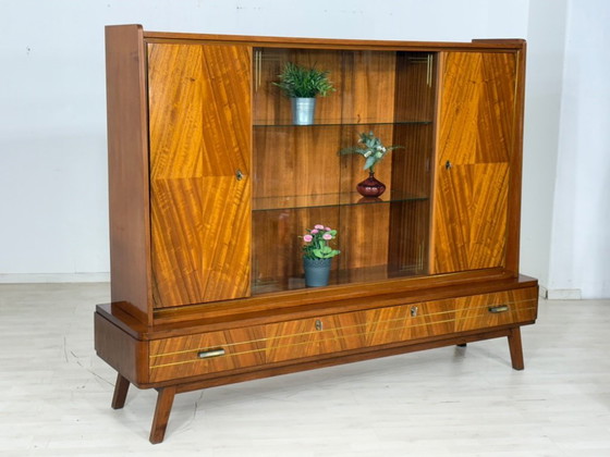 For sale is a beautiful vintage highboard in very good condition. This piece of furniture impresses with its elaborate veneer work and the elegant lines of the 1960s. It consists of two parts and offers versatile storage space thanks to its glass elements and closed compartments – ideal as a bar cabinet, china cabinet, or living room cabinet.