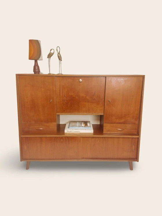 This century cabinet stands on characteristic tapered legs and has beautifully finished handles! The highboard has some minor scratches but is otherwise in excellent condition.