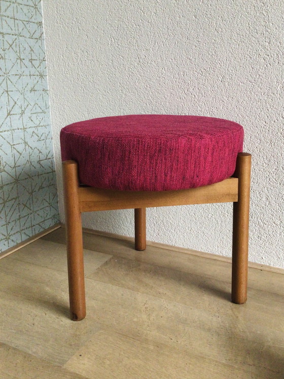 Step back in time with this exquisite Vintage Mid Century hocker from Denmark. This piece embodies the elegance and simplicity of mid-century design, offering a perfect blend of form and function. Its vibrant red textile seat is beautifully complemented by the warm tones of the wooden legs, making it a striking addition to any room.
