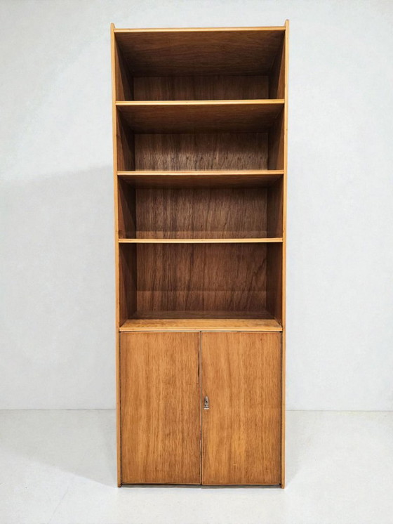 A tall, functionalist bookcase crafted in the Netherlands during the 1960s or 1970s. The unit features a clean, geometric form with three open adjustable upper shelves and a spacious lower storage cabinet with two hinged doors. The piece is likely finished in a warm-toned wood such as oak or teak veneer, which was common for Dutch furniture of this era. Its simple lines and "form follows function" philosophy make it a versatile addition to any modern interior.
