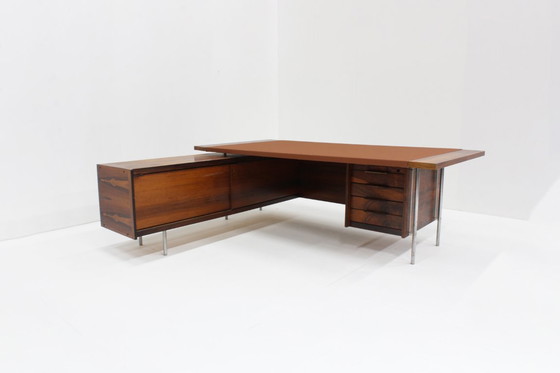 Mid-Century executive desk made of rosewood with beautiful grain patterns in the veneer. The cognac faux leather upholstery is new. Convenient sliding doors and drawers for storage and chrome feet. The desk is in good condition with vintage signs of wear commensurate with its age; scratches on the wood and chrome. The desk will be delivered disassembled.
