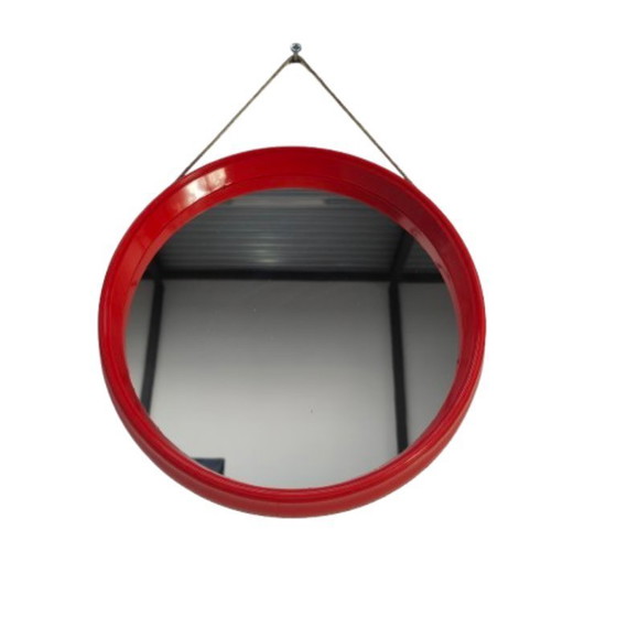 Add a bold pop of color to your home with this authentic red Space Age mirror. This round plastic wall mirror from the 1970s embodies the playful and futuristic aesthetic of that era, complete with a sturdy hanging cord for a bold touch. It's a functional piece of vintage decor that, thanks to its bright color and distinctive design, fits perfectly in a mid-century modern hallway, bathroom, or living room. A durable and timeless design object that instantly adds character and a touch of nostalgia to any space.