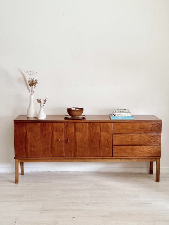 The sideboard is made of walnut veneer with a beautiful pattern and further stands out for its beautiful clean and minimalist design. The handle-less doors and drawers are striking.