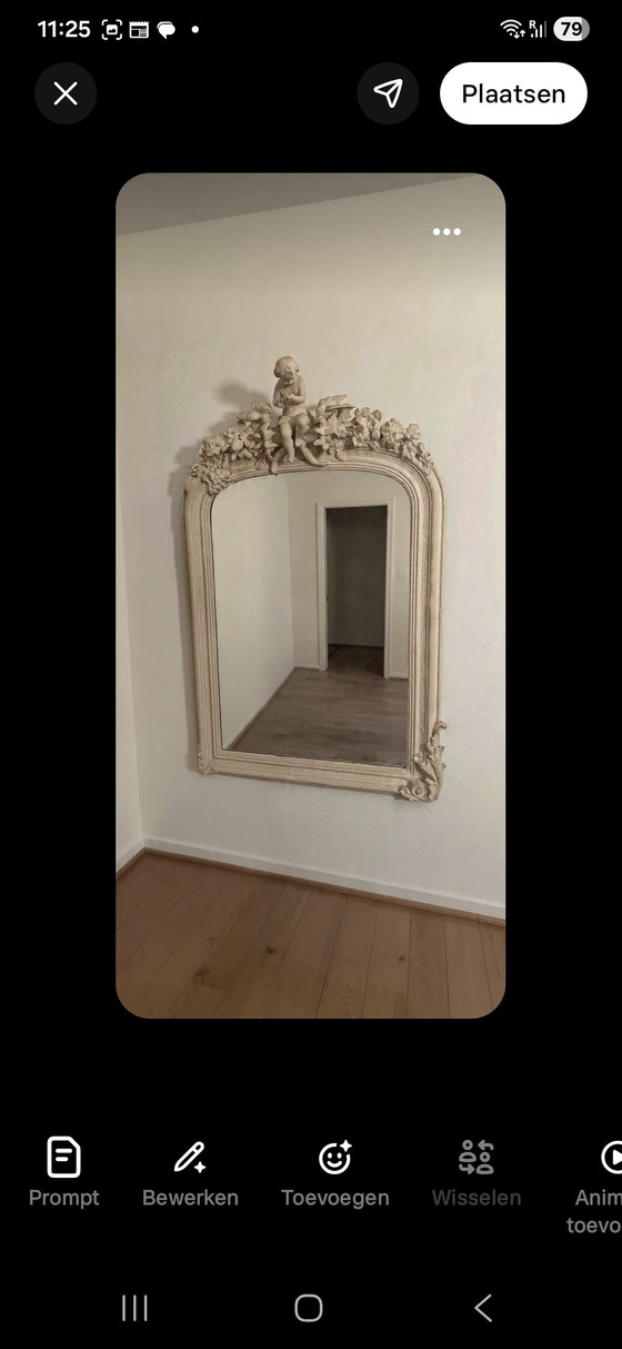 This beautiful antique mirror with an angel is a sophisticated addition to any interior. The mirror exudes classic elegance, with its detailed Baroque frame and a graceful angel enthroned atop it. The craftsmanship is clearly visible in the finely detailed flowers and decorative elements adorning the frame.