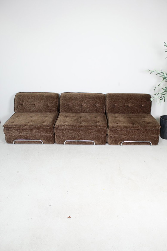 This brown modular sofa dates from the 1970s and can also be used as a sofa bed. The chrome frame is supported by three cushions. Modular sofas are back in style, making this one a perfect fit for a modern interior.