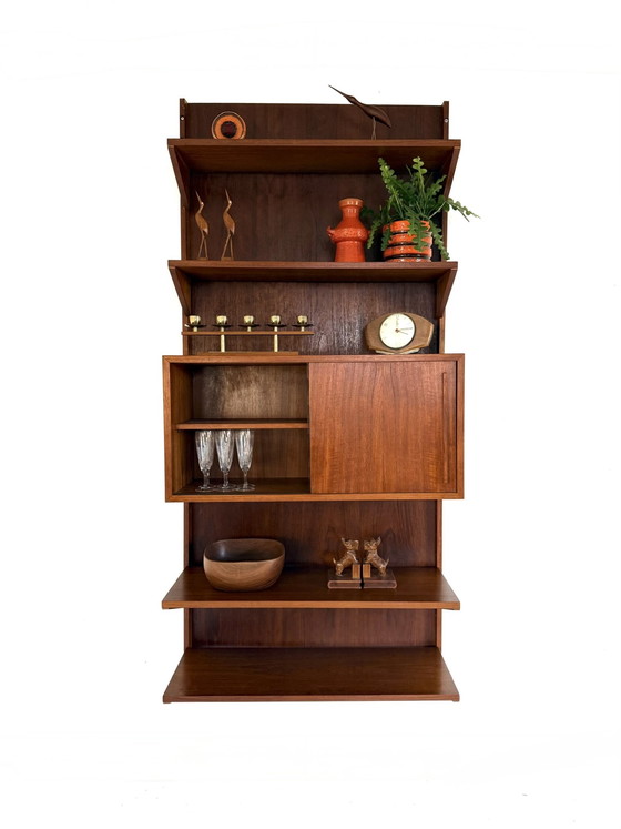 The wall system is modular and can be arranged entirely to your liking. Finished in a warm teak tone with beautiful visible wood grain. A lovely wall filler and also an eye-catcher in your home. In excellent condition.