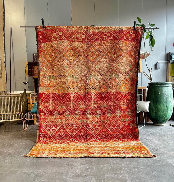 Crafted from 100% natural sheep wool, this Boujad rug features a structured composition of diamond motifs arranged in horizontal bands, enriched with ancestral Berber symbols. The color palette blends warm shades of red, orange, terracotta, ochre, and soft beige, with subtle variations that give the rug depth and movement. These colors, softened by time, create a rich vintage patina unique to authentic Boujad rugs.