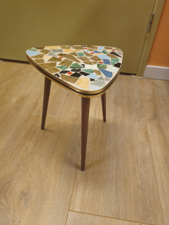 Vintage mosaic side table or plant stand with various colored mosaic tiles, brass-colored edging, and black and conical legs.