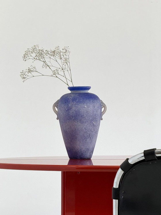 This vintage Murano amphora vase is crafted in cobalt blue and frosted glass with a distinctive grainy texture. The mouth-blown object was manufactured using the Vetro Scavo technique from the 1980s, resulting in a weathered, antique appearance with a subtle matte surface and soft color nuances.