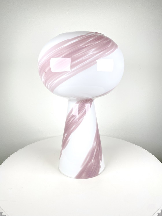 An iconic hand-blown Murano glass mushroom/globe-shaped tabletop lamp, featuring white opaline glass with a light rose-colored mottled swirl pattern. A very rare color and pattern combination of the 1970s classic design piece!