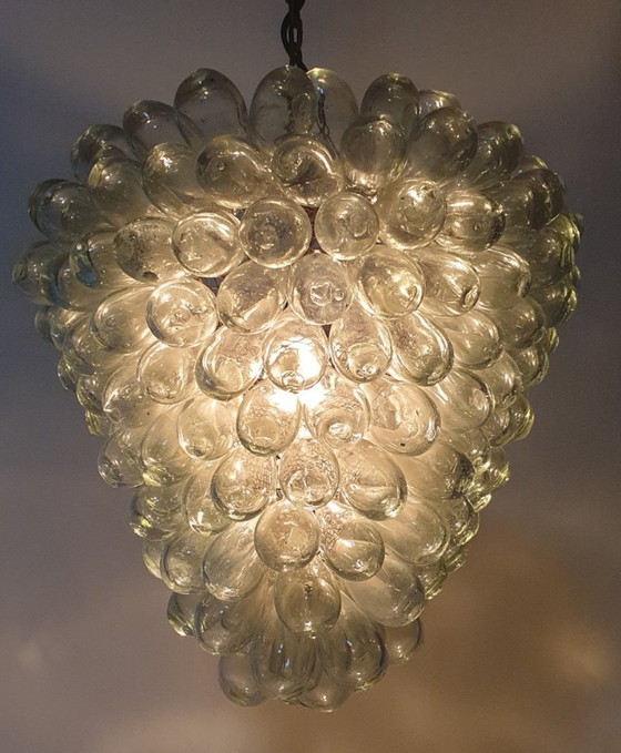 Murano grape lamp from the 1960s. The lamp consists of a steel frame to which hand-blown glass grapes are attached. Each grape is unique, which also makes the lamp unique. The entire piece is in good condition; all the glass is intact, and the lamp is complete. A few grapes have black spots on the inside; I don't know if these are in the glass or on the inside of the grapes, but they are not bothersome. See the last photo. Dimensions: diameter of the lamp is 35 cm, height of the glass is 35 cm, total length is 110 cm. The lamp will be carefully packaged and shipped insured.