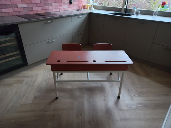 Vintage desk, galvanized base painted white for rust resistance. The tabletop has paint stains, but can easily be repainted in any color.