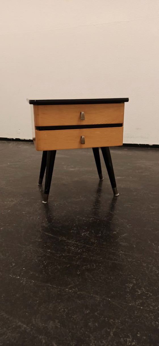 Vintage mid century night stand with 2 drawers. Some scratches and signs of use. Height 51 cm Width 47 cm Depth 35 cm