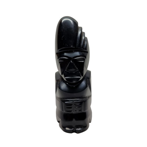 This vintage obsidian Aztec idol is a characterful and decorative object from Mexico, dating from the 1970s. The statue is handcrafted from obsidian, also known as volcanic glass.