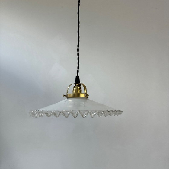 Vintage opaline glass pendant light with a scalloped edge. Beautiful light. New wiring with black twisted fabric cord. Ready to connect with a terminal block. Small screw-in socket (E14 bulb) and black metal ceiling rose. Shade diameter: 25 cm Shade height: 5.5 cm Ross diameter: 8 cm Cable length: 1 m Weight: 0.5 kg Table lamp, articulated lamp, desk lamp, wall lamp, pendant light, ceiling light, vintage, garage, portable lamp, opaline glass, Clichy glass, industrial lamp, accordion lamp, zip-zag lamp, gooseneck, factory workshop, industrial, Fresnel lens, Arlus, Cremer, Kaiser Idell, Jumo, Gras Ravel Clamart, Jielde Holophane, Sanfil, Solere, Kandem, Mazda, Midgard, Perriand, Le Corbusier, Singer, Hala, Luxo, Bauhaus, Schaco, Super Chrome, wall lights, Art Deco lights, factory lamp SCONCES, DESK LAMP, FACTORY SCISSOR LAMP