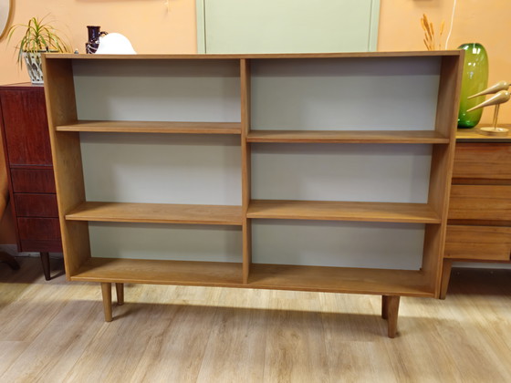 Beautiful vintage open highboard or bookcase with four adjustable shelves, ideal for displaying books, decorations, or collections. The cabinet stands on charming round legs and has a timeless look that fits into various interior styles. A functional and stylish piece of furniture for any room.