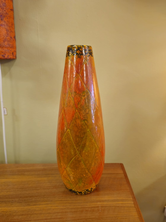 Beautiful vintage vase from Germany, crafted in vibrant orange and green tones. This ceramic vase features a unique diamond pattern and is a real eye-catcher for any interior. Perfect for lovers of retro design and West German pottery.