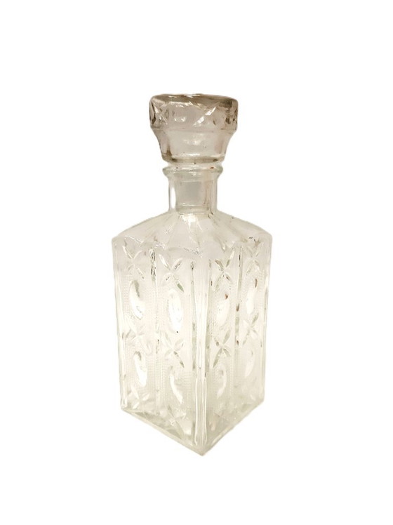 This exquisite vintage glass decanter, complete with its original stopper, is a testament to timeless elegance and refined craftsmanship. Its ornate design, featuring intricate patterns etched into the glass, captures the light beautifully, making it a stunning centerpiece for any dining or bar setting.
