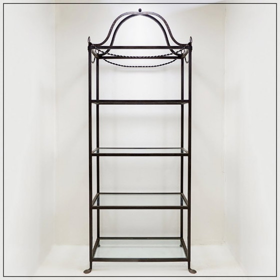 Vintage black metal shelves with a distinctive pagoda design. Featuring four glass shelves, they offer an elegant space to display your favorite items. Perfect for adding a touch of retro charm to your home.