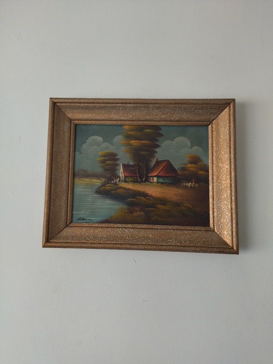 Discover this magnificent oil painting on canvas, an authentic mid-20th-century work that captures a bucolic landscape with remarkable finesse. The thatched cottages by the water, bathed in soft light, evoke a serene and timeless atmosphere.