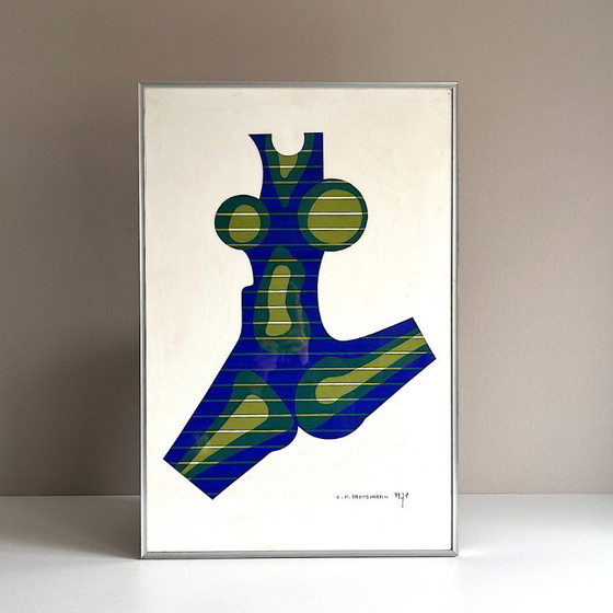 Vintage painting. Collector's item. Egon Peter Moosmann. Female torso. Op Art. 1970s. Hand-signed. Dated. Mid-Century Modern.