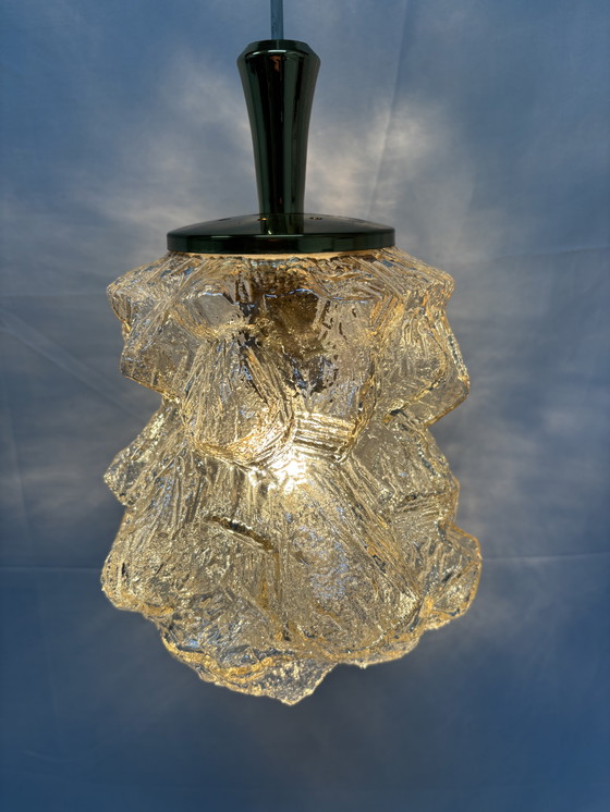 Beautiful Peill & Putzler pendant lamp, model "Alaska." This 1970s icon is known for its impressive glass shade made of thick, textured crystal glass that resembles melting ice or a rugged glacier.