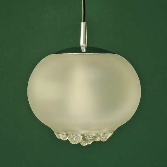 Stylish vintage pendant lamp by German brand Peill & Putzler, designed in the 1970s. The lamp is made of a combination of frosted glass and clear glass, with a striking, drop-shaped structure at the bottom that creates a beautiful lighting effect.